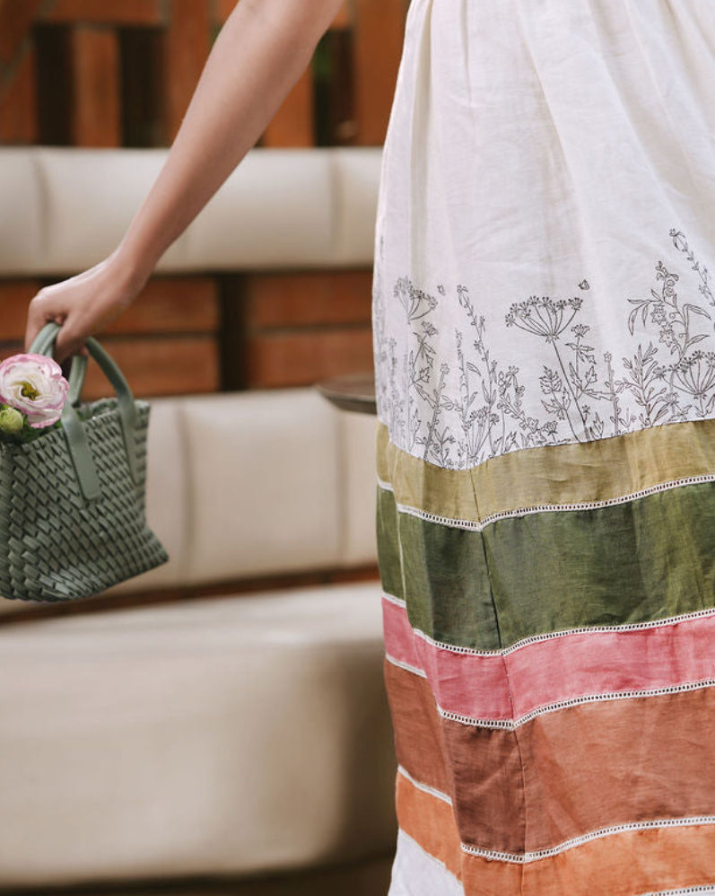 A joyful hand block–printed linen midi dress with soft lining — the perfect summer silhouette. Playful stripes meet ease and comfort in this breezy wardrobe essential.
